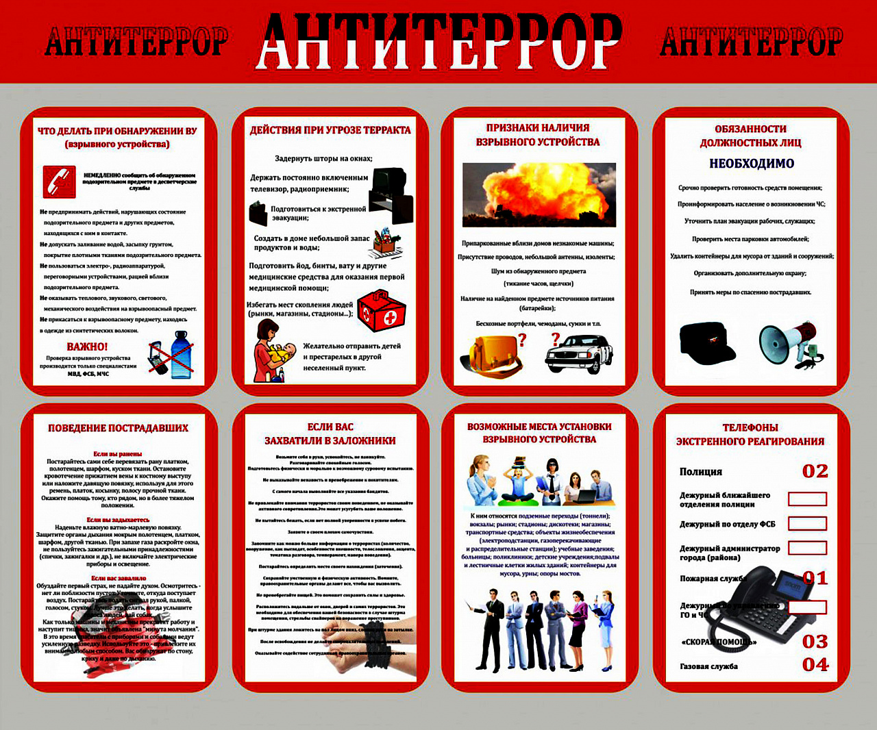 К террористическому акту невозможно подготовиться заранее, поэтому следует быть настороже всегда. Следует проявлять особую осторожность на многолюдных мероприятиях, в популярных заведениях, в больших магазинах.